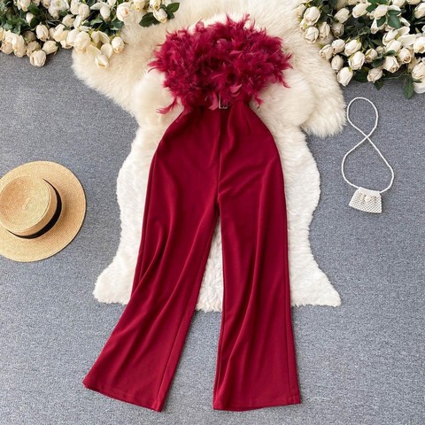 Mono de tubo con borlas de plumas de lujo para mujer, monos adelgazantes de cintura alta, mono recto de pierna ancha para mujer, Verano