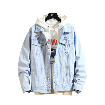 Düz zarif Denim Ceket yırtık hafif uzun kollu kolej erkek Denim Ceket